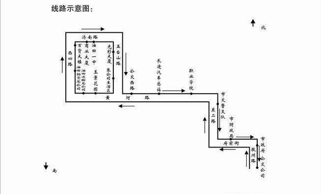 101線路自2011年3月23日起,將原線路調(diào)整為單向循環(huán),起止站為市公交公司,不再進(jìn)公交西站。西城部分路段調(diào)整后走向:由市公交公司發(fā)車(東城線路不變),沿黃河路直行經(jīng)玉景花園、油田運(yùn)輸公司、油田物資公司、百貨大樓、供銷商場(chǎng)、商業(yè)大商、油田一中、光彩大廈、勝大中心超市、協(xié)和醫(yī)院、公交西站,經(jīng)黃河路返回公交公司。以上站點(diǎn)按順時(shí)方向靠路右側(cè)站點(diǎn)停車上下乘客,其他路段與原線路、站點(diǎn)相同,票價(jià)不變。歡迎廣大乘客屆時(shí)乘車。