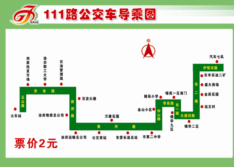 111路:該線路自汽車七隊始發(fā),經(jīng)伊犁河路(華瑞小區(qū))、東二路(盛大商場、運五村)、大渡河路(錦華五區(qū))、東一路(錦華九區(qū)),改經(jīng)華苑路(錦苑一區(qū)南門、錦苑小學(xué))、華山路(金山小區(qū)),到達(dá)黃河路后,恢復(fù)原線路,單程里程24.3公里,票價、班次均不變。