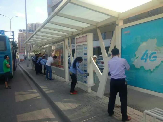 公交候車亭上面粘有透明膠、不干膠、漿糊等,有的候車亭燈箱還被糊上了好幾層廣告,黨員們手拿小鏟子、小刷子、清潔球、水桶等清除工具,三人一組、兩人一伙,有的噴水,有的用鏟刀用力清除,一個個干的熱火朝天。經(jīng)過三個多小時的清理,西四路兩側(cè)公交候車亭衛(wèi)生死角和野廣告被清理干凈,市民的候車環(huán)境衛(wèi)生得到很大改觀。在候車亭等車的市民們高興地說:“站牌上到處都是小廣告,各種顏色的,像牛皮癬一樣討厭,這些黨員真能干,小廣告沒有了,在候車亭等車心情也舒暢了。”