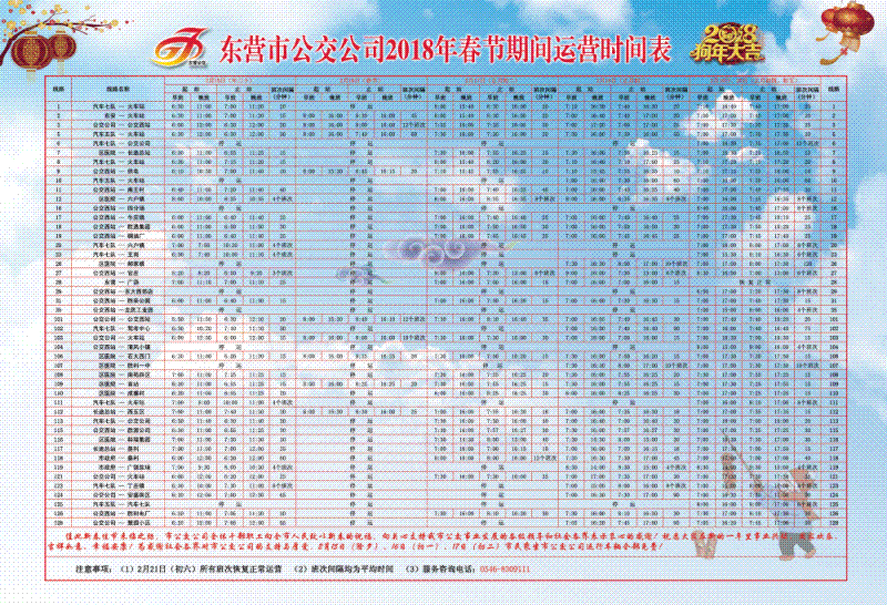 為答謝社會(huì)各界一直以來給予我市公交事業(yè)的關(guān)心和支持,東營(yíng)市公交公司春節(jié)期間線路運(yùn)行時(shí)刻表新鮮出爐,今年年三十、年初一、年初二市民乘坐市公交公司運(yùn)行車輛全部免費(fèi)。