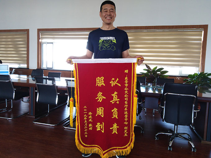 2019年5月28日下午,徐先生拿著一面寫有“認(rèn)真負(fù)責(zé)、服務(wù)周到”的錦旗來(lái)到市公交公司公共自行車運(yùn)營(yíng)中心,感謝巡檢員劉文玉幫助找回丟失公共自行車認(rèn)真負(fù)責(zé)的態(tài)度和高尚品德。