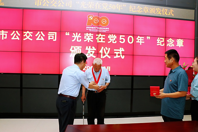 6月24日上午,在中國共產(chǎn)黨成立100周年即將到來之際,東營公交組織開展了“光榮在黨50年”紀念章頒發(fā)儀式。公司黨委書記趙龍、經(jīng)理劉海、副經(jīng)理孫紅光、景洪培和黨齡50周年老黨員以及黨員代表等參加了頒發(fā)活動。