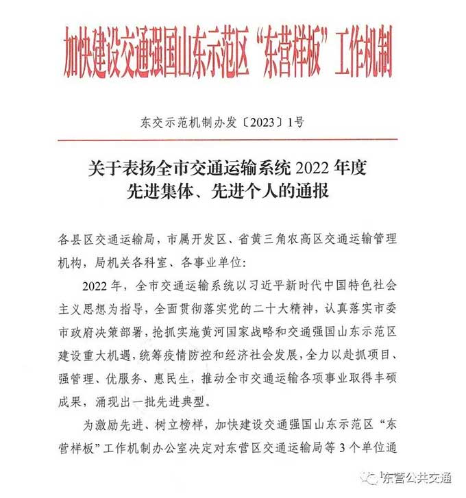 會上,加快建設(shè)交通強(qiáng)國山東示范區(qū)“東營樣板”工作機(jī)制辦公室印發(fā)了2022年度全市交通運(yùn)輸工作交通先鋒先進(jìn)集體及先進(jìn)個(gè)人表彰決定。市公交公司、市公交公司辦公室、市公交公司保修二廠獲得交通先鋒先進(jìn)集體榮譽(yù)稱號,2名同志獲得交通先鋒先進(jìn)個(gè)人榮譽(yù)稱號。