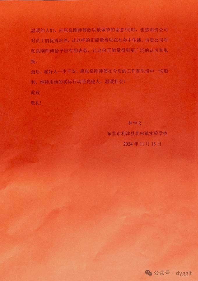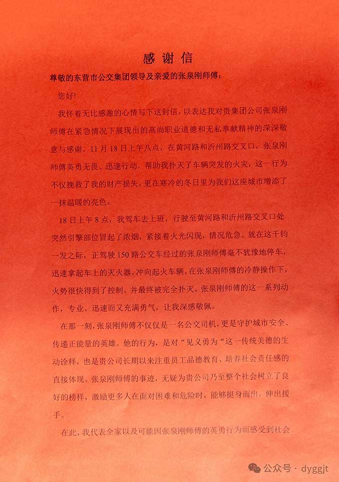 車主林先生特意寫來一封感謝信并制作了一面錦旗表達謝意,字里行間充滿了對張泉剛師傅的感激之情。他在信中提到,張泉剛師傅的行為早已超越了公交駕駛員的基本職責范疇,堪稱守護城市安全衛(wèi)士和傳遞正能量的楷模一點也不為過。他用實際行動生動詮釋了“見義勇為”這一中華民族的傳統(tǒng)美德,同時也彰顯了東營市公交集團在職工品德教育方面的卓越成效,以及對培養(yǎng)職工社會責任感的高度重視。