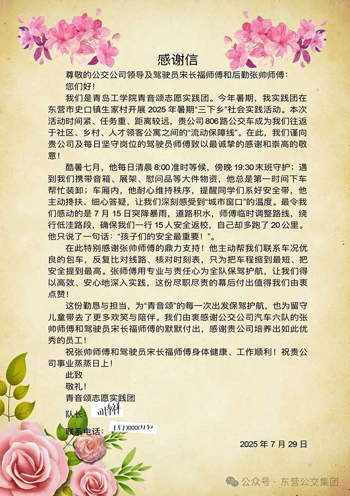 原來,在今年的暑假期間,青音頌志愿實踐團(tuán)在東營市史口鎮(zhèn)生家村開展2025年暑期“三下鄉(xiāng)”社會實踐活動,負(fù)責(zé)本次806路班車任務(wù)的宋長福細(xì)致入微的服務(wù),讓志愿團(tuán)的師生深受感動。宋長福師傅在執(zhí)行本次班車任務(wù)過程中,自清晨8:00的準(zhǔn)時等候,到傍晚19:30分的守護(hù),從幫助師生搬運大件行李,到行車中的安全提醒,細(xì)心答疑,特別是在7月15日突降暴雨時及時調(diào)整路線,規(guī)避積水區(qū)域,為保障了師生15人的安全返校,給予了最大的安全守護(hù)!