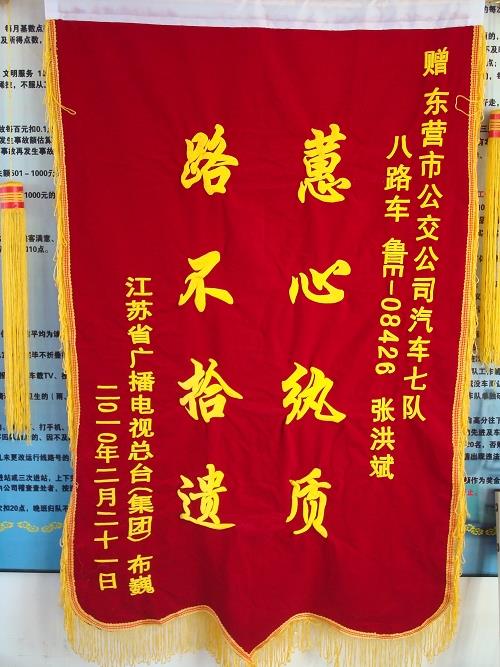 原來,2月20日,初次來東營走親訪友的失主布巍小酌后準(zhǔn)備返程,不小心將手提包丟在8路車上,內(nèi)有DV機(jī)、出國護(hù)照和工作證等物件,年后就準(zhǔn)備出國的他非常著急。經(jīng)過查詢與汽車七隊(duì)取得聯(lián)系,當(dāng)?shù)弥眯鸟{駛員張洪斌已將失物及時(shí)上交車隊(duì),失主布巍非常感動(dòng),因急于趕回單位出國,沒能當(dāng)面致謝,特寄來錦旗表示謝意。