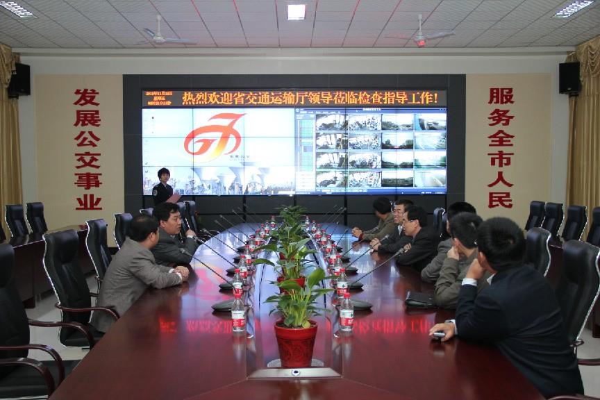 11月18日上午,省交通運輸廳“兩保兩樹”活動指導(dǎo)組王際遜處長一行,在市交通運輸局工會主席王愛軍、運管處處長李希俊、市公交公司經(jīng)理朱新民等有關(guān)領(lǐng)導(dǎo)的陪同下,到東營公交智能調(diào)度指揮中心對3G視頻監(jiān)控系統(tǒng)進行了檢查指導(dǎo)。