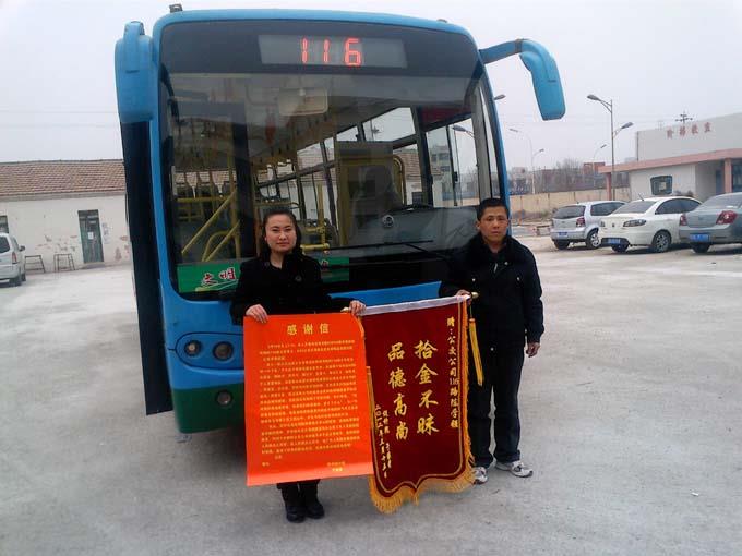 2012年3月14,勝利設(shè)計(jì)院職工于家星女士拿著一面寫有“拾金不昧、品德高尚”的錦旗和感謝信來到市公交公司汽車四隊(duì),感謝116路魯E08350車駕駛員陳學(xué)強(qiáng)師傅拾金不昧的高尚品德。