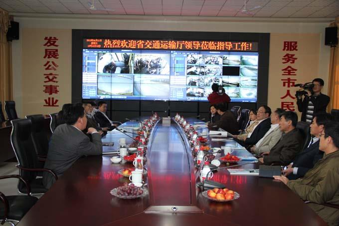 檢查組在相關(guān)領(lǐng)導(dǎo)的陪同下來到東營(yíng)公交智能調(diào)度指揮中心進(jìn)行了實(shí)地檢查與座談。工作人員將公交智能調(diào)度系統(tǒng)的實(shí)時(shí)監(jiān)控、數(shù)據(jù)查詢、統(tǒng)計(jì)等功能和公交3G視頻監(jiān)控系統(tǒng)的遠(yuǎn)程視頻監(jiān)控、錄像資料查詢、遠(yuǎn)程指揮調(diào)度以及安全防范等功能向謝廳長(zhǎng)以及各位領(lǐng)導(dǎo)進(jìn)行了詳細(xì)的講解和演示。