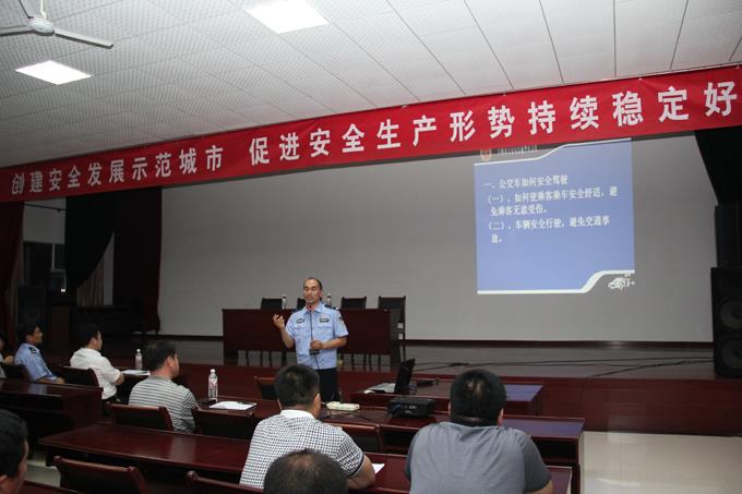 2012年5月30日晚,“創(chuàng)建安全發(fā)展示范城市,促進(jìn)安全生產(chǎn)形勢持續(xù)穩(wěn)定好轉(zhuǎn)”安全講座走進(jìn)市公交公司活動(dòng)在我單位大會(huì)議室舉行,車隊(duì)安全管理人員和部分一線駕駛員以及后勤職能科室相關(guān)人員聽取了由市交警支隊(duì)宣傳科劉井泉科長、姜濤副科長和交警一大隊(duì)宣傳中隊(duì)陳新建中隊(duì)長講解的安全知識(shí)講座。講座分別圍繞開展六月份“安全生產(chǎn)月”活動(dòng)的重要性、公交車安全駕駛常識(shí)、駕駛員安全管理、案例分析和觀看幻燈片等方面進(jìn)行。